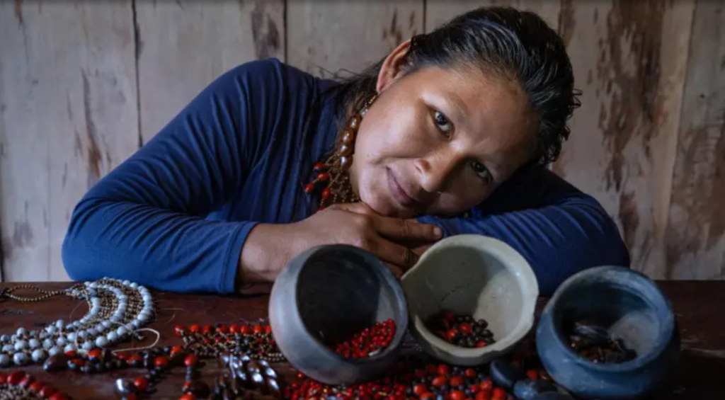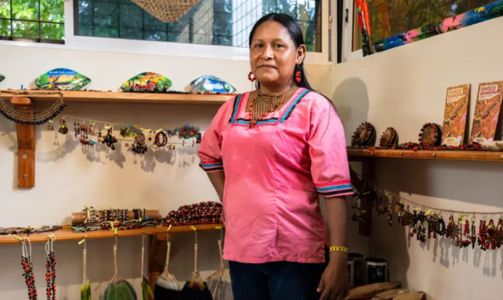 La distancia entre Aguarico y el resto del país ha afectado históricamente la venta de artesanías que reflejan los mitos y la biodiversidad local. Para enfrentarlo, en 2020 nació Sacha Maki (en kichwa: sacha = selva, maki = mano), una iniciativa comunitaria y ecotienda liderada por mujeres indígenas.