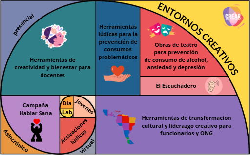 A partir de estos insumos, adaptamos los contenidos en las formaciones de Entornos Creativos para escuelas, equipos de salud, áreas de juventud, desarrollo humano y cultura, y centros comunitarios. De este modo, la metodología mantiene un marco común, situado y sostenible en cada contexto local. El siguiente esquema sintetiza cómo Entornos Creativos permite un abordaje integral y flexible, combinando distintos componentes que pueden activarse en su totalidad o parcialmente, según los diagnósticos y necesidades de cada territorio.