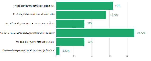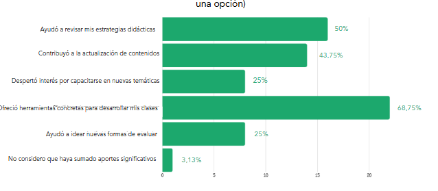 Una docente que participó de una de las Formaciones de Formadores en Entornos creativos para el bienestar y puso en juego las herramientas en el aula, lo expresó así: “Me encontré con muchas angustias, chicos que necesitaban hablar de temas personales y encontraron en este espacio un lugar seguro, donde poder desahogarse”. Además, los docentes que participaron del curso de formación “Entornos Creativos: Arte, Juego y Comunidad en la Escuela que Transforma” señalaron en las encuestas de evaluación que el curso contribuyó en su desempeño docente de la siguiente manera: